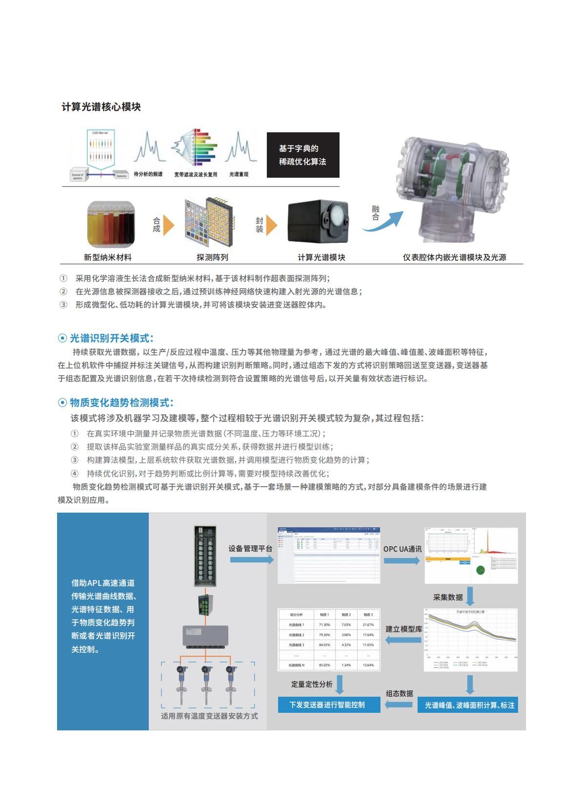 原位光譜檢測變送器,是一款以溫度變送器為主體結構、融合微型計算光譜的新型變送器, 是基于物質熒光特性的擁有光譜檢測能力的創新型現場儀表,可在原先溫度測量點位基礎上額外感知光譜信息,具有體積小、成本低、響應快等特點。 在化工、制藥等領域, 可通過內置激光光源的激發, 實時獲取物質熒光光譜數據, 并結合配套工具軟件,將光譜信號中所蘊含的信息上送至控制系統及診斷系統。 幫助用戶深入理解生產反應過程、優化工藝參數、提升產品質量,最終實現高效、安全、穩定的生產。原位光譜檢測變送器支持光譜識別開關、 物質變化趨勢檢測兩種模式, 支持RS485、APL兩種通訊方式,并結合上層管理軟件,實現光譜數據獲取、關鍵譜點信息標注、 識別策略注入、 成分識別算法學習及構建等。